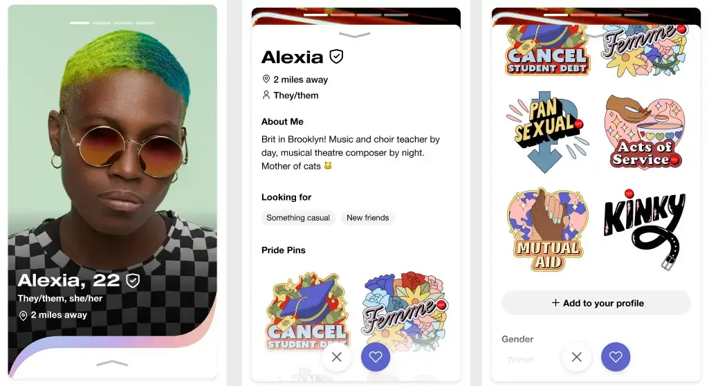 Esta app es inclusiva y ofrece opciones para una amplia gama de orientaciones sexuales y de género. Además, permite a los usuarios reaccionar a partes específicas de un perfil, como fotos o respuestas, para expresar interés de manera más precisa.